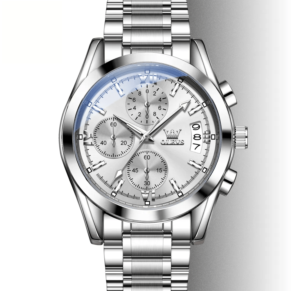 The OLEVS 2987 Men’s Chronograph is a stylish and multifunctional timepiece designed for men who appreciate elegance with everyday utility. Featuring a polished stainless-steel case, precise quartz chronograph movement, and luminous hands, it delivers both accuracy and readability. The watch includes functional sub-dials for stopwatch and date display, complemented by a durable, comfortable strap. With its modern luxury look and reliable performance, the OLEVS 2987 is perfect for both formal and casual wear.
