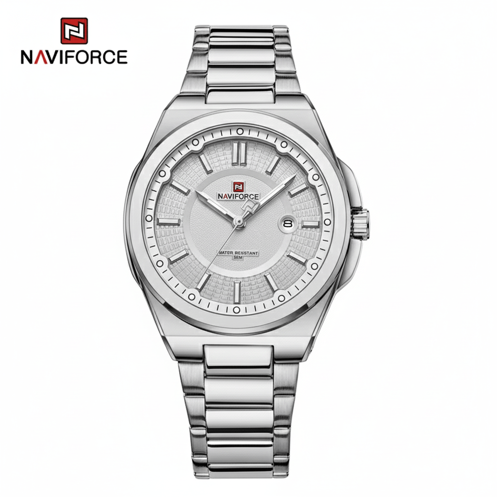 Naviforce 9212 Silver is a stylish and durable men’s wristwatch featuring a 43mm stainless steel case, hardened mineral glass, luminous hands, and a precise quartz movement. With its elegant design and date display, it’s perfect for both formal and everyday wear—offering premium looks at an affordable price—Naviforce 9212 Price in Bangladesh.